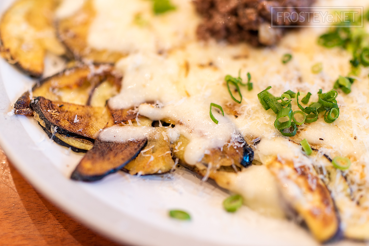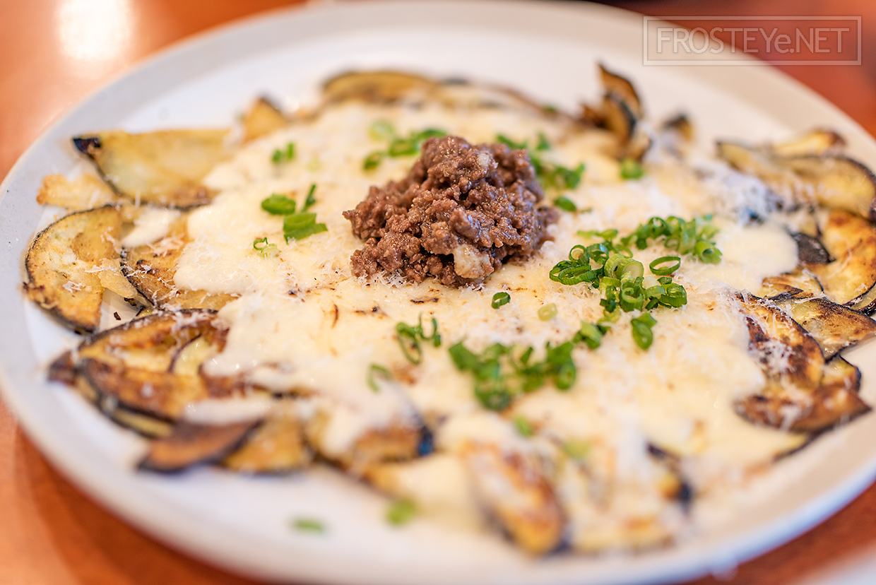 바짝 지진 가지 위로 치즈가 올라가 있고, 쇠고기가 중앙에 소복히 올라가있습니다.